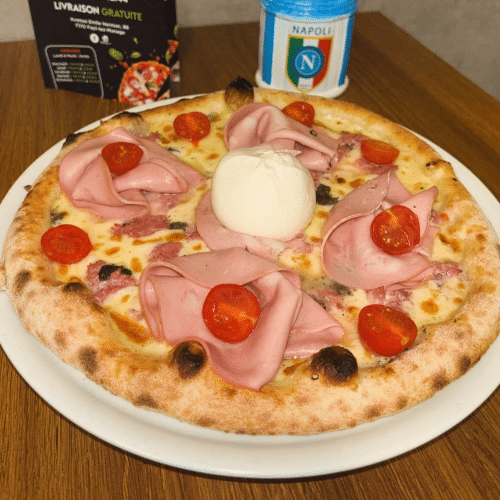 Mozzarella, straciatella, mortadella, roquette, balsamique, copeaux de parmesan, tomate cerise.